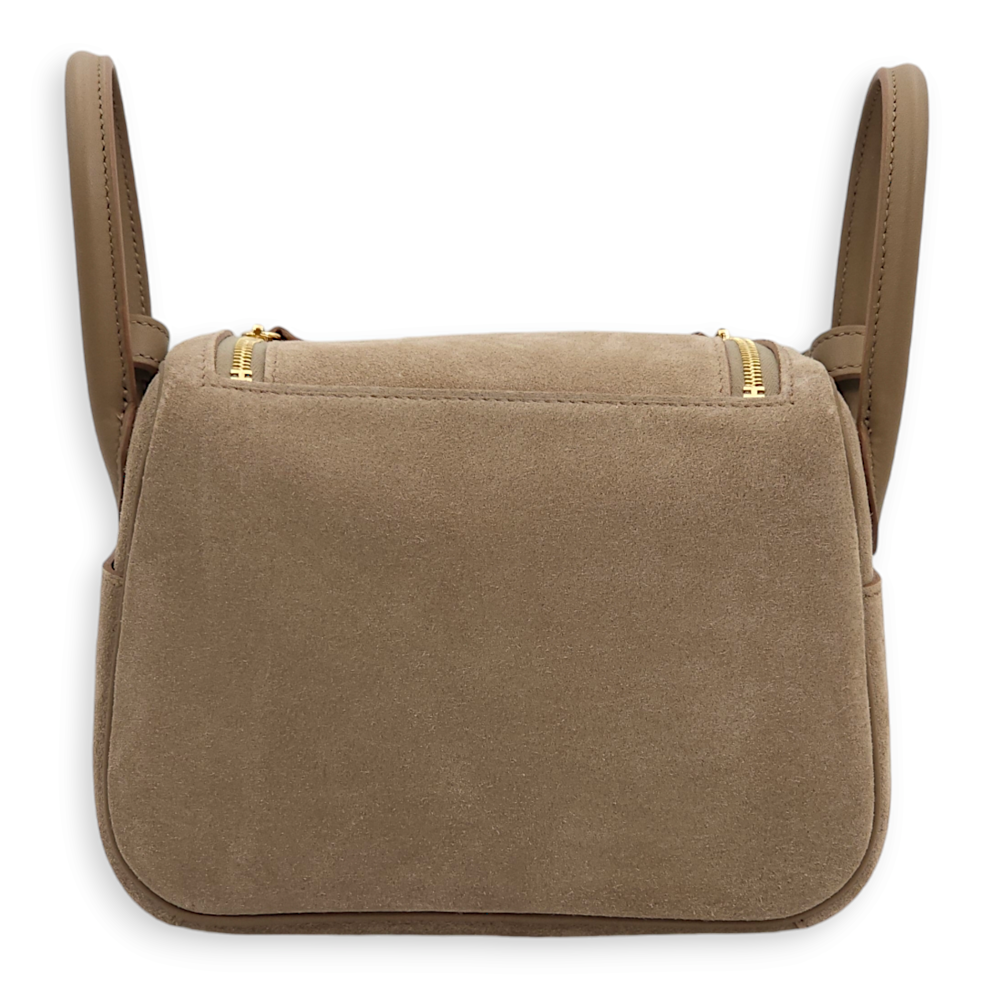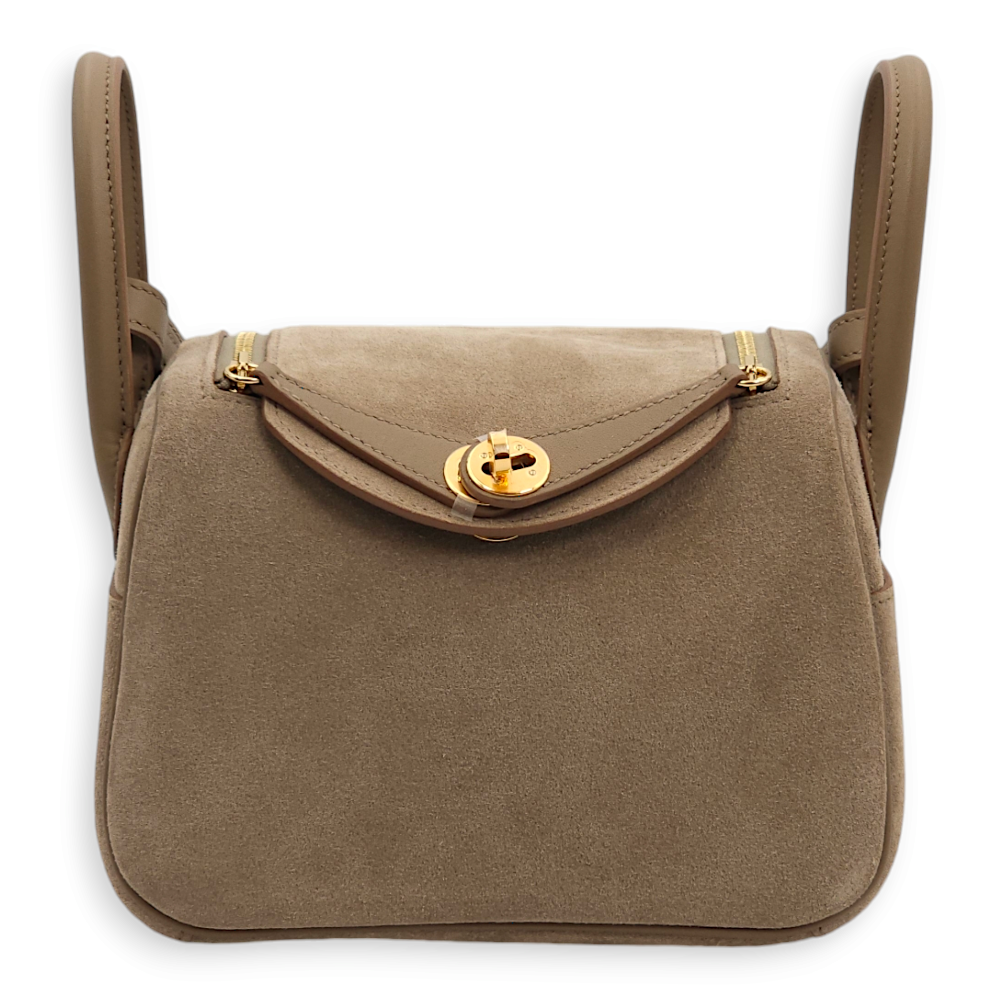 (Purely handmade customization, 10-15 days construction period) HermèsLindy Mini Gris Caillou/Etoupe in Swift, Gold hardware