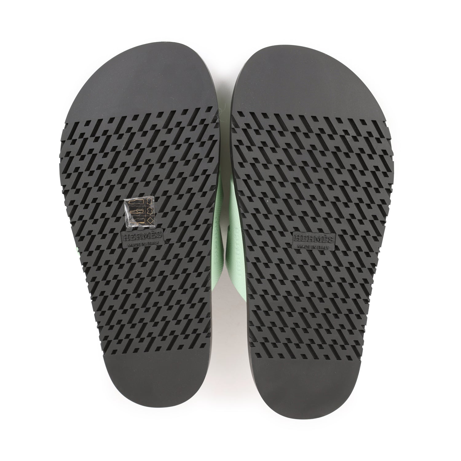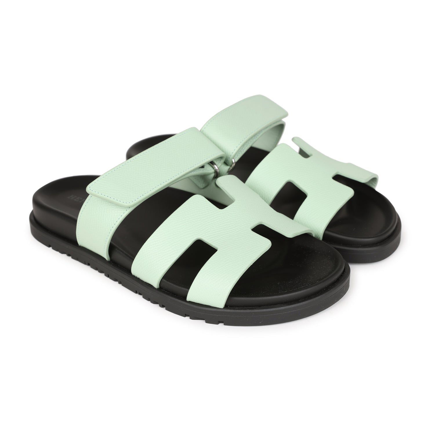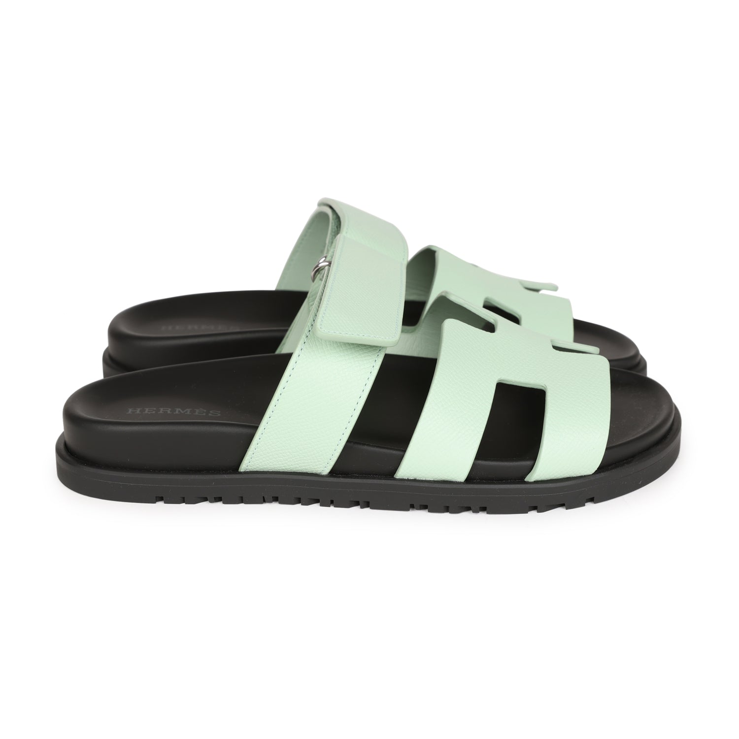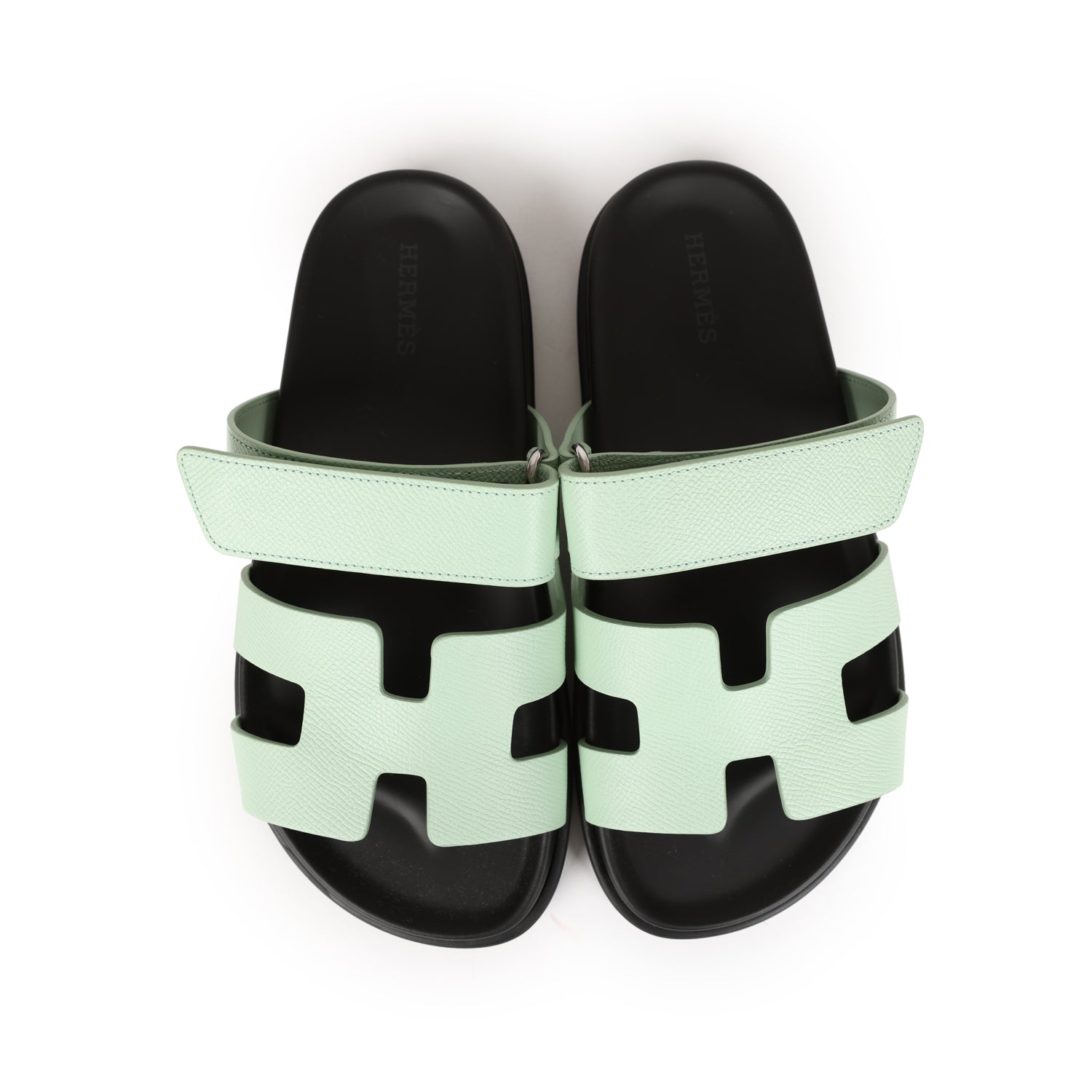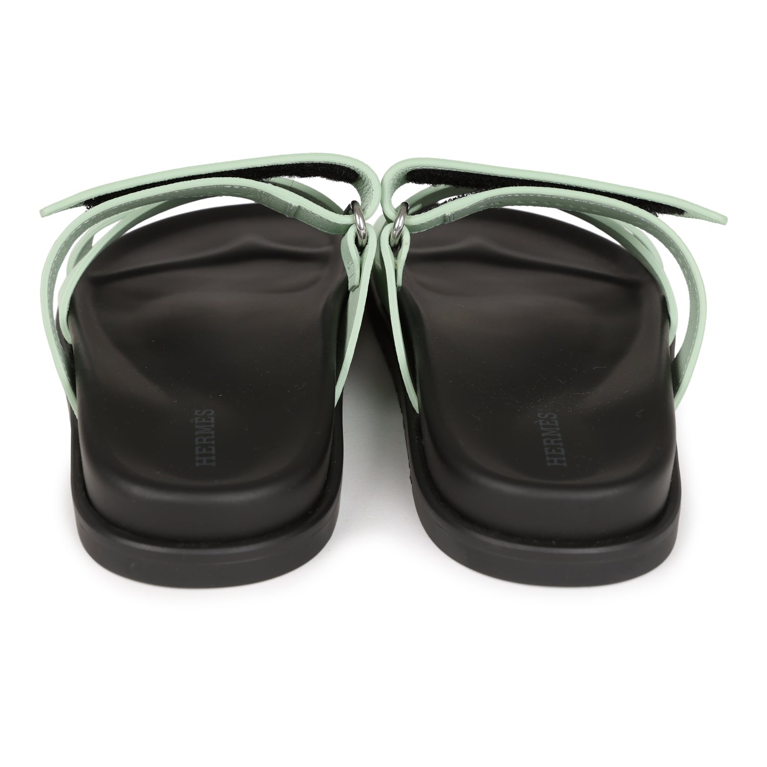 This pair of Cypre sandals are in Vert Jade Epsom and feature the iconic H and a velcro crossover strap.
