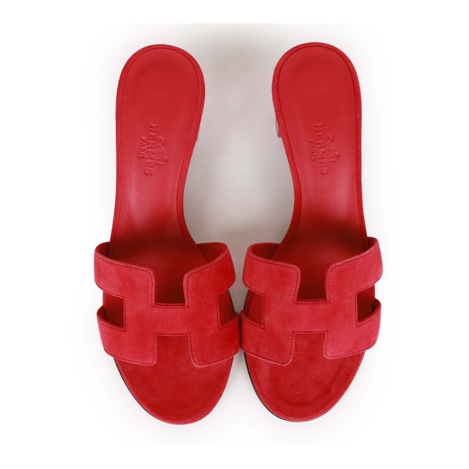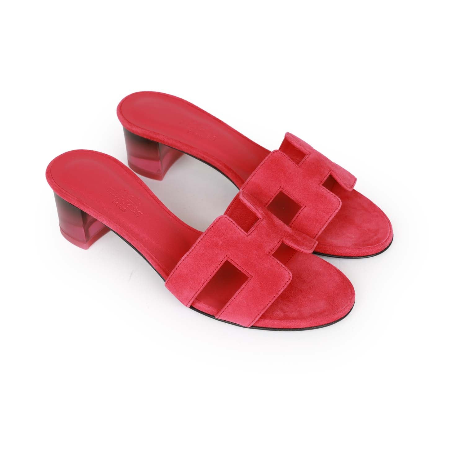 This pair of Oasis Sandals are in Rose Framboise suede with a gradient block heel and the iconic H crossover strap