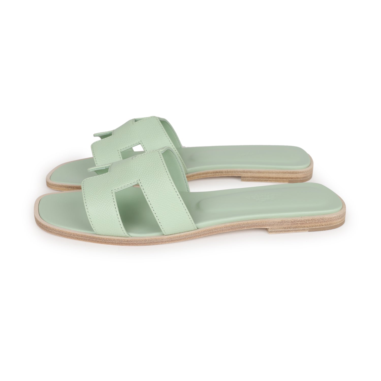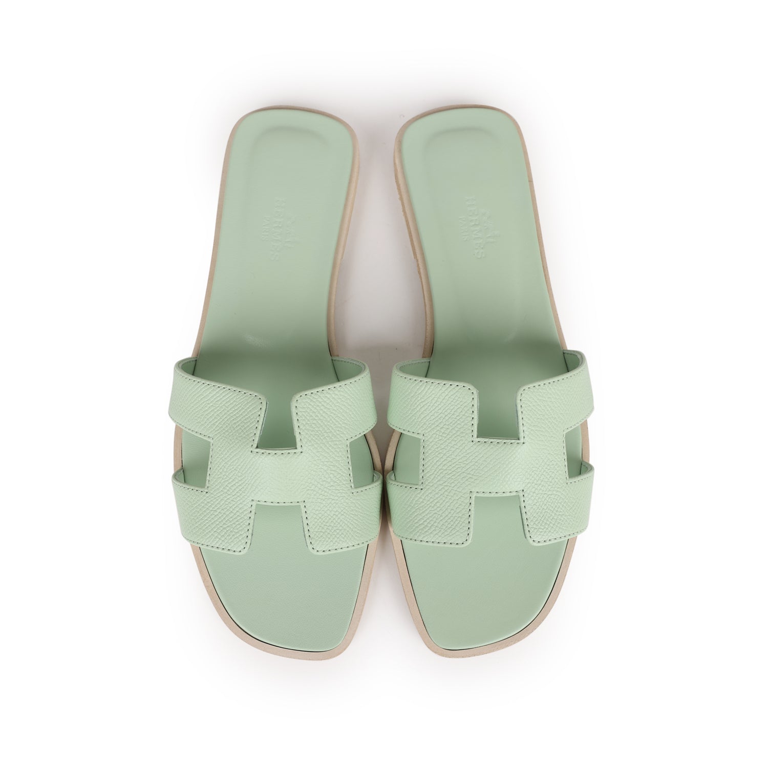 This pair of Oran Sandals are in Vert Jade epsom with the iconic H crossover strap, Vert Jade Goatskin insole, Grezzo leather heel, and natural leather soles.